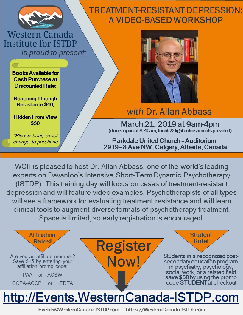 The Western Canada Institute for ISTDP (WCII) is pleased to host Dr. Allan Abbass, one of the world’s leading experts on Davanloo’s Intensive Short-Term Dynamic Psychotherapy (ISTDP). This training day will focus on cases of treatment-resistant depression and will feature video examples. Psychotherapists of all types will see a framework for evaluating treatment resistance and will learn clinical tools to augment diverse formats of psychotherapy treatment.