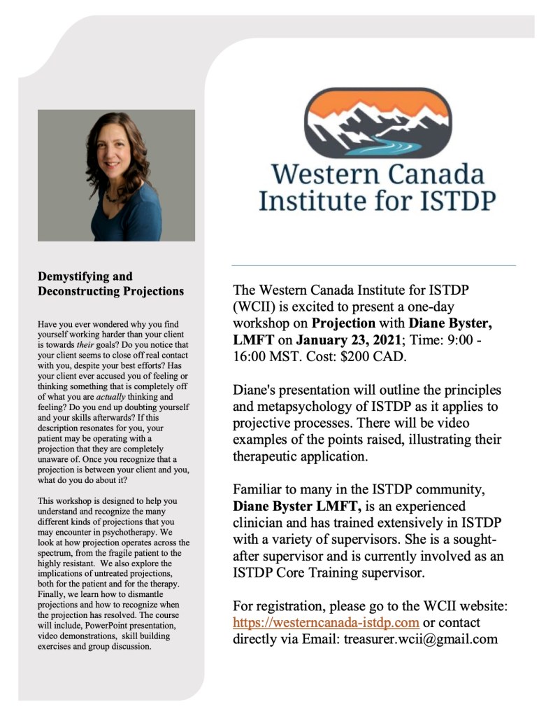 This workshop is designed for current and past ISTDP core trainees and registered mental health professionals, to help you understand and recognize the many different kinds of projections that you may encounter in psychotherapy.